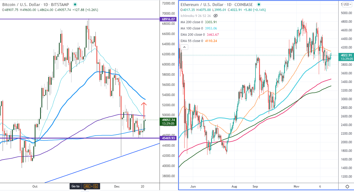 BTCUSD is consolidating after hitting a high of $49600. The pair is struggling to close above $50000 levels. The pair hits an intraday low of $48656 and is currently trading around $49071.