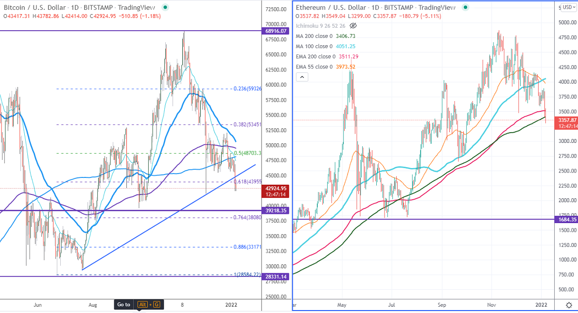 BTCUSD breaks significant support $45000 and hits a low of $42413. The pair is holding below 200-day MA ($48059) for the past five days. It is currently trading around $46926.