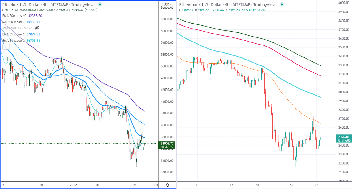 BTCUSD declined after a minor pullback to $38946. It hits an intraday low of $35535 and is currently trading around $36859.