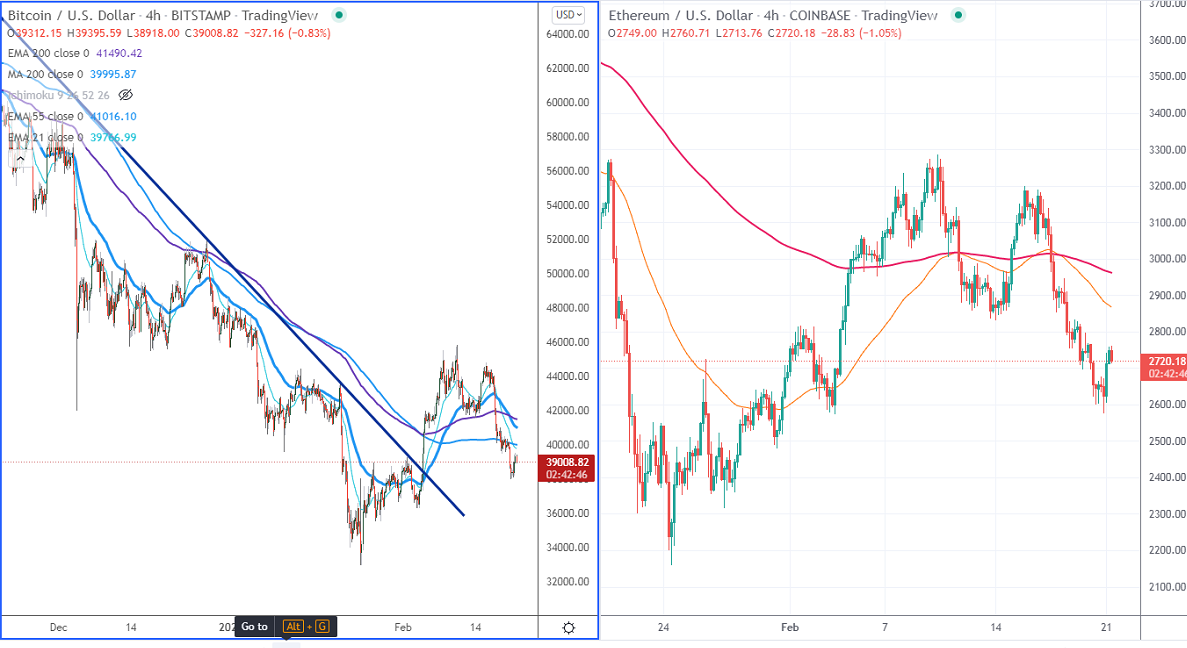 BTCUSD continues to trade weak for the fifth consecutive day and slips well below $40000. The escalation of tension between Russia and Ukraine has decreased the demand for riskier assets. According to on-chain data, 60% of BTC supply has not been moved in last year. It confirms that long-term investors are adding Bitcoin at lower levels. It hits a low of $37974 and is currently trading around $39120.