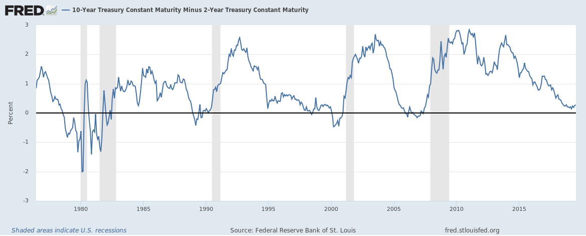 The spread has been steadily declining since 2014, as the U.S. Federal Reserve raised interest rates from 0.25 percent to 2.25 percent, pushing short-term rates higher, while lower inflation expectation pushed long-term yields lower.