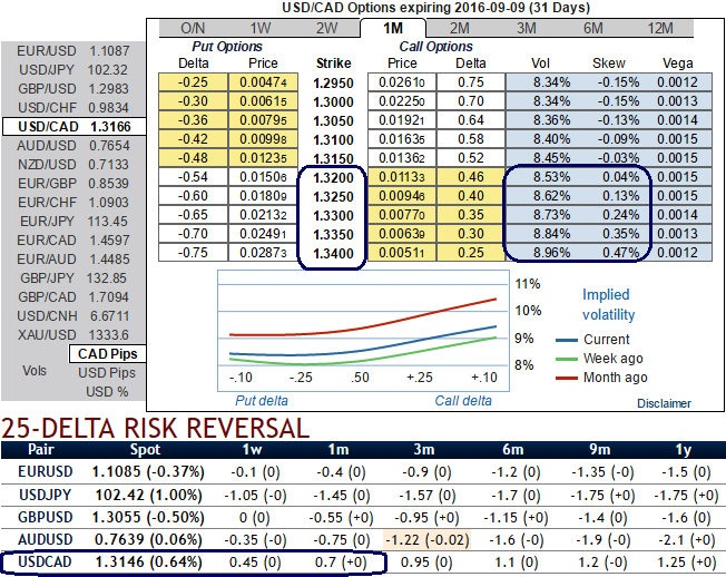 Buy USDCAD 1w call spread with strikes of 1.3250-1.3083 for a net debit.