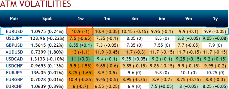 As we can make out from the volatilities of EURUSD ATM contracts, it is comparatively higher side even at 1W tenor. So option premiums on either direction would be highly volatile regardless of swings, one can get benefitted from such situations by buying one touch binary vega calls in order to extract leverage on extended profits.