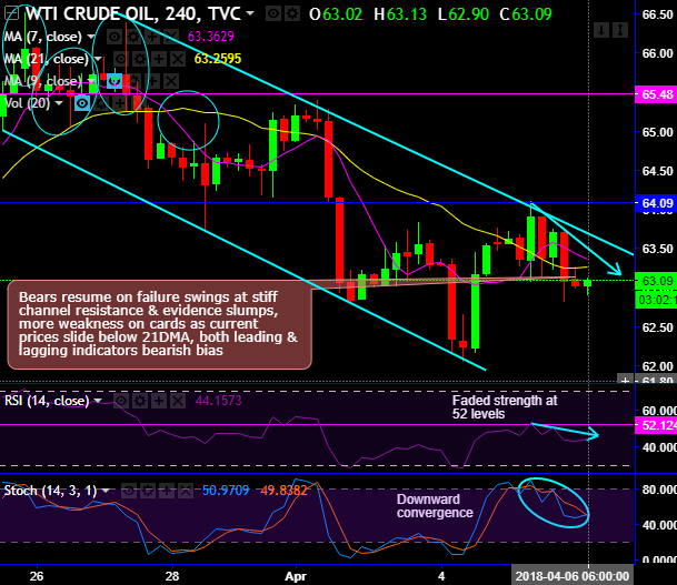 Bears resume on the failure swings at the stiff channel resistance of $64.12 levels, consequently, evidence the steep slumps. More weakness seems to be on the cards as the current prices slide below 21DMA.