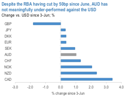 On top of that, the RBNZ has proven quite sensitive to global developments; this week’s testimony from Powell focusing exclusively on global uncertainty is likely to galvanize a response from the Bank. Indeed, their next meeting in August is live and is well-priced, but there remains potential to reload their easing bias to help draw down rates and FX further. 2Q inflation next week may present some event risk (consensus is for a rebound to 0.6% q/q, JPM 0.5% from 0.1% in Q1) but this ought not to deter the medium-term RBNZ path at this juncture.