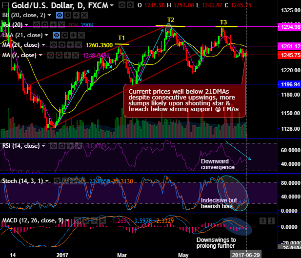 The upswings in consolidation phase have rejected at 1294.50 levels, consequently, tumbled and breached below 50% Fibonacci retracement levels. Expect more slumps upon breach below strong supports at 1250 levels.