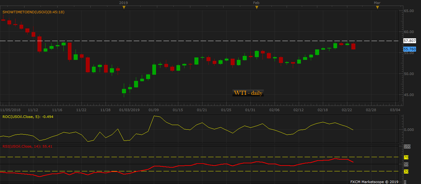 - Price has now declined from $57.5 per barrel during the European hours to $55.8 per barrel, and the price continues to break lower.
