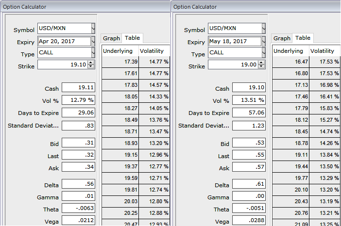 The execution: Initiate shorts in 1m (1%) out the money calls with positive theta, simultaneously, buy 2M (1%) in the money 0.51 delta call option. Establish this option strategy if USDMXN spot FX is either foreseen to be in sideways or spike up considerably over the next month but certainly not beyond your upper strikes in short run.