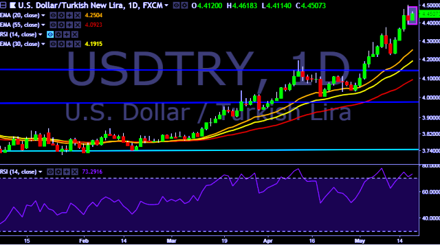 We prefer to go long on USD/TRY around 4.4400, stop loss at 4.4100 and target of 4.5006/4.5254.