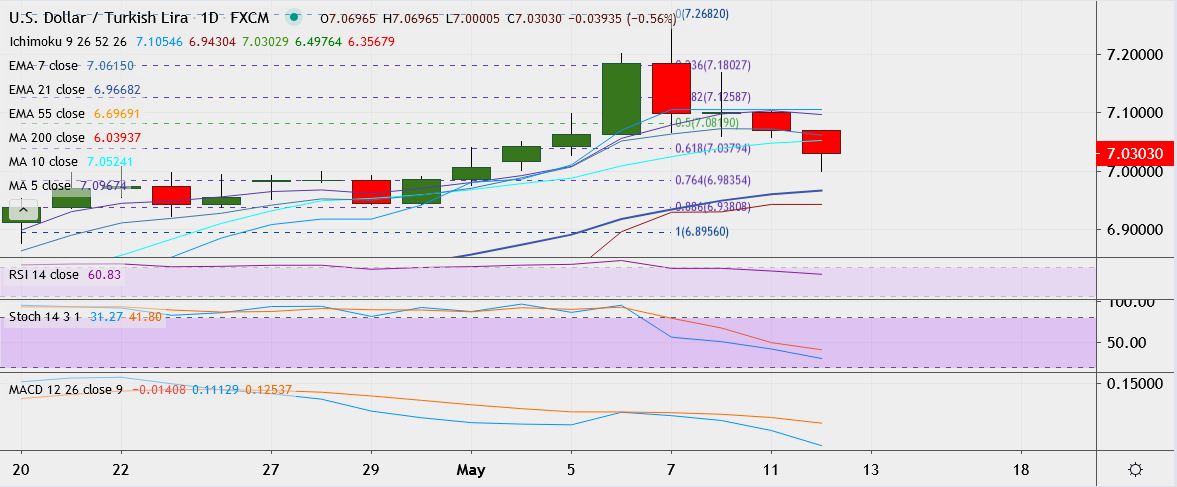 - On the downside, support is seen at 6.9786 and break below could take it near 6.9604 (21-EMA).