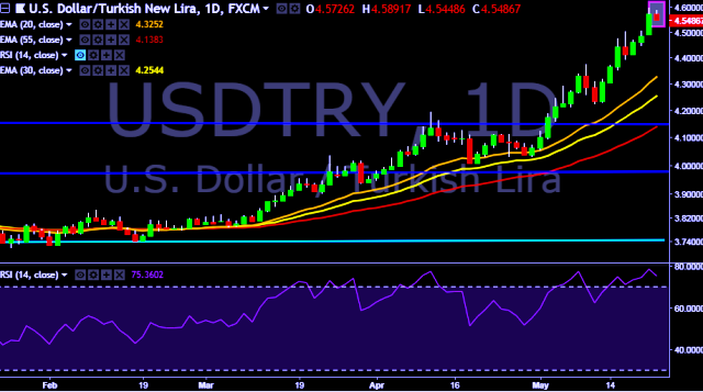 We prefer to go short on USD/TRY around 4.5500, stop loss at 4.6000 and target of 4.4875.