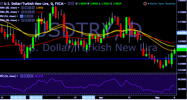 We prefer to go long on USD/TRY around 3.5880, stop loss 3.5558 and target of 3.6238.