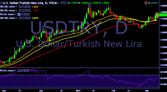 We prefer to go long on USD/TRY around 3.7520, stop loss 3.6703 and target of 3.8038.