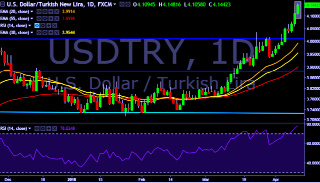 We prefer to go long on USD/TRY around 4.1350, stop loss at 4.0563 and target of 4.1845.