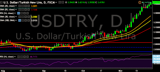 We prefer to go long on USD/TRY around 3.4150, stop loss at 3.4050 and target of 3.4387.