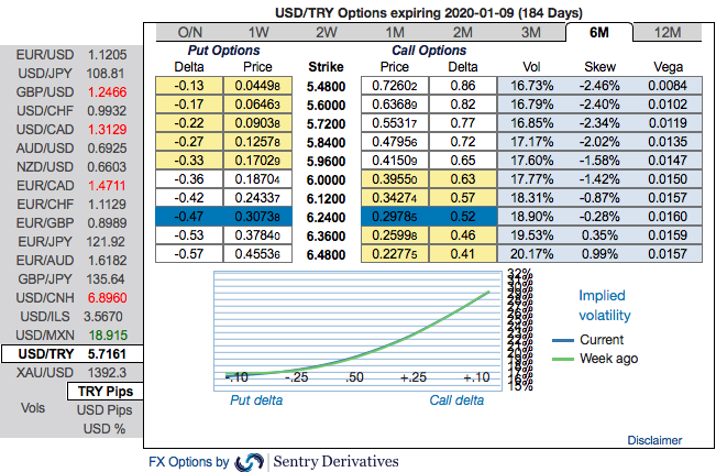 It seems that hedgers of TRY are positioned for the upside risks on the above fundamental factors. The positively skewed IVs of 6m tenors are bidding for OTM calls strikes up to 6.48 levels.