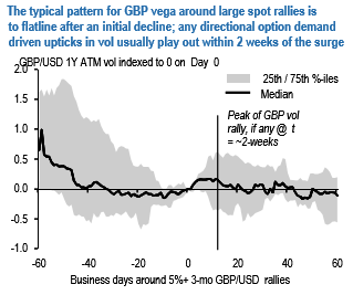 History strongly argues in favor of such muted vega response: The above table shows that 5%-10% quarterly spot moves in GBP keep 1Y ATMs more or less unchanged on average, with a sharp skew towards vol weakness rather than strength. Larger than 10% spot rallies almost always lead to material vol compression, but the inference could be distorted by the post-GFC experience of a V-shaped sterling rebound and inverse V-shaped vol collapse following the introduction of US QE which is not an appropriate lens to view the current episode.
