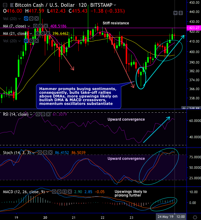 Bitcoin cash (BCHUSD) has formed a hammer pattern at $380.77 levels that prompt buying sentiments, consequently, bulls take-off rallies above DMAs.