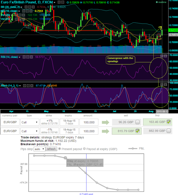 Since short term uptrend is anticipated we like to extract the leverage benefits from buying 15D (1%) Out-Of-The-Money call while shorting 7D (-1%) In-The-Money call for a net credit. This spread strategy may result in a loss if EURGBP declines at expiration. Maximum loss cannot be more than the initial debit taken to enter the spread position.