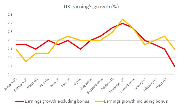 The UK is in a major political trouble. In the recent election, Prime Minister Theresa May’s Conservative Party fell short of an outright majority in the Parliament and is being forced to govern a minority government with the support from Ireland’s Democratic Unionist Party. In addition to that, the time is running out for the Brexit negotiations, which needs to be completed before March 2019. Several economic dockets released recently shows that the UK economy might finally be losing some steam, especially the housing sector. The first quarter GDP growth was much weaker at just 0.2 percent q/q, much lower than other European peers. Bank of England’s (BOE) inflation report forecasted softening of inflation. It is very important to keep on assessing the economic well-being to understand the impact of this ‘first-time ever’ event.