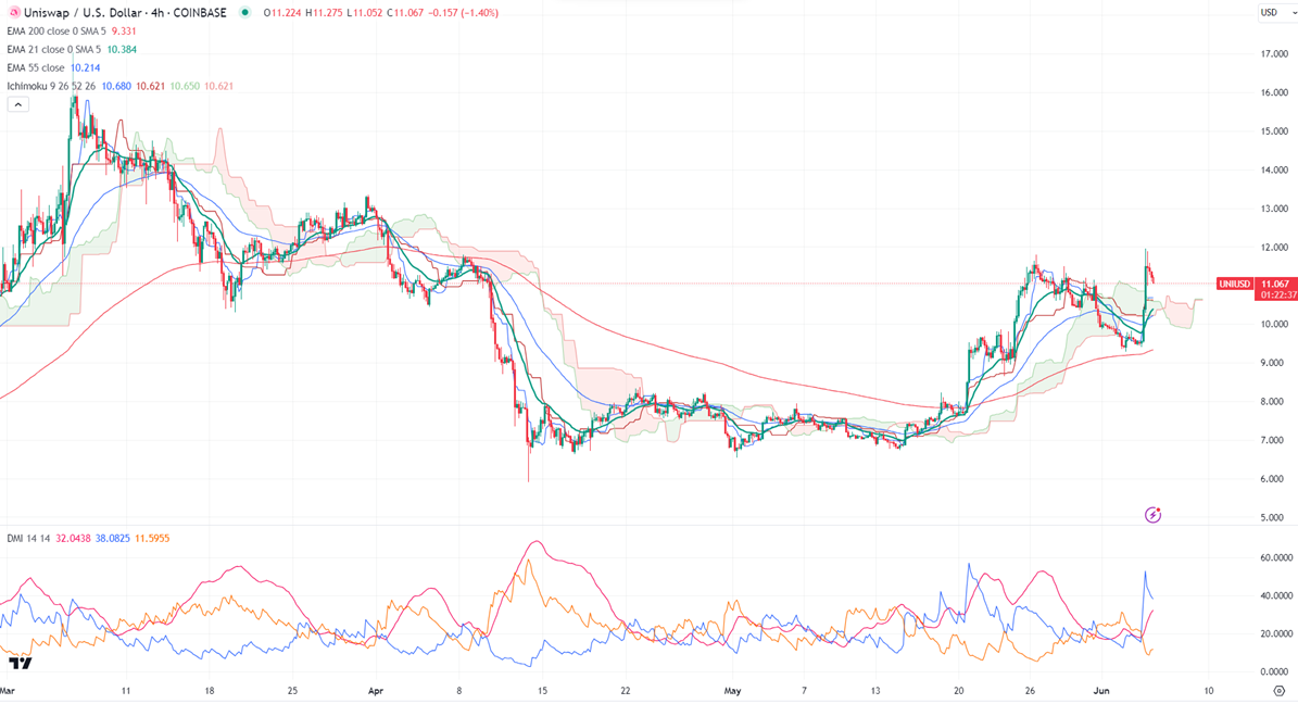 UNIUSD showed a massive jump of more than 85% in the past one month. The pair holds well above the short-term (21 and 55 EMA) and long-term moving average. It hit a high of $11.95 and is currently trading around $11.09.