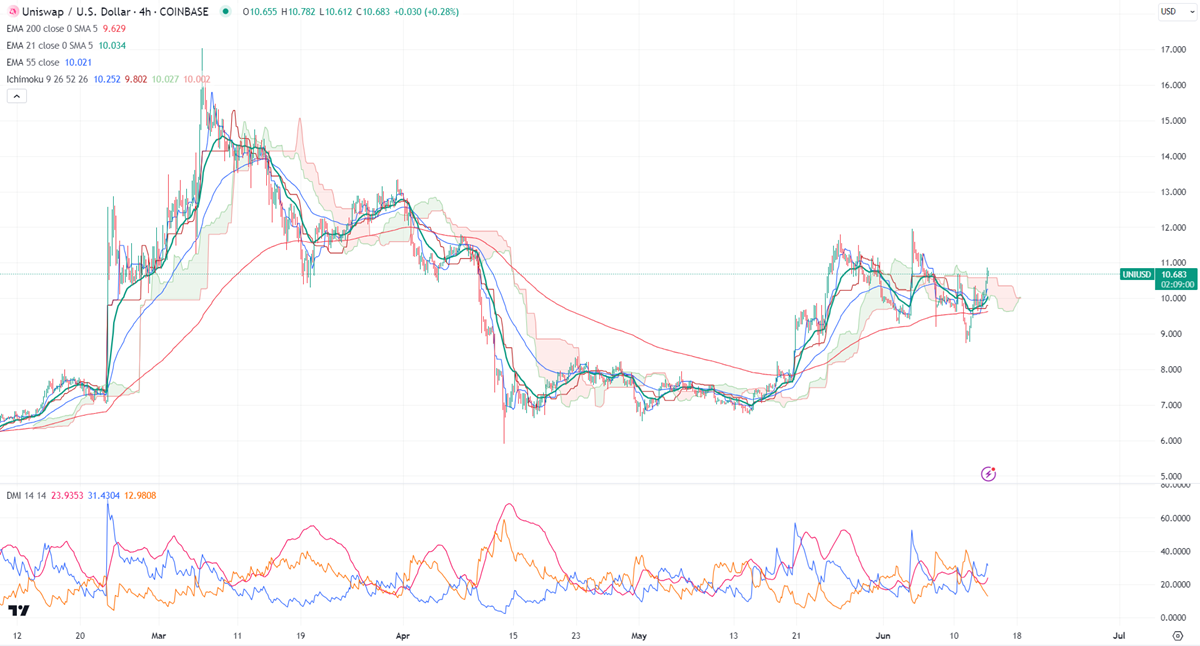 UNIUSD showed a massive jump of more than 20% in the past three days. The pair holds well above the short-term (21 and 55 EMA) and long-term moving average. It hit a low of $8.74 and is currently trading around $10.68.