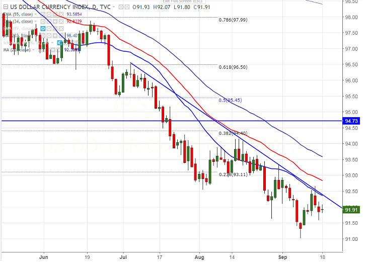 - US Dollar index has declined mildly after showing a minor jump above 20- day MA. It is currently trading around 91.96.