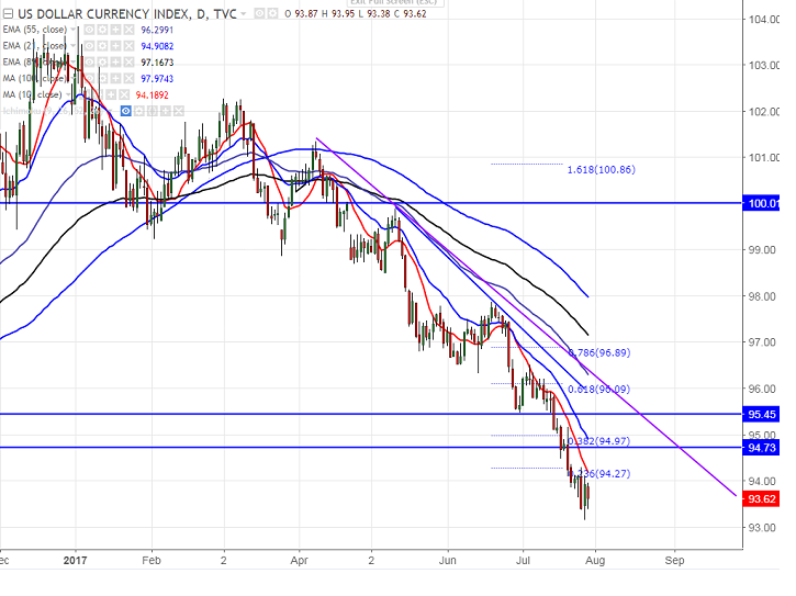 - In the daily chart, index upside capped by 10 day MA at 94.35 and any break above will take the DXY till 95.03 (21- day EMA)/96.10 (61.8% fibo).