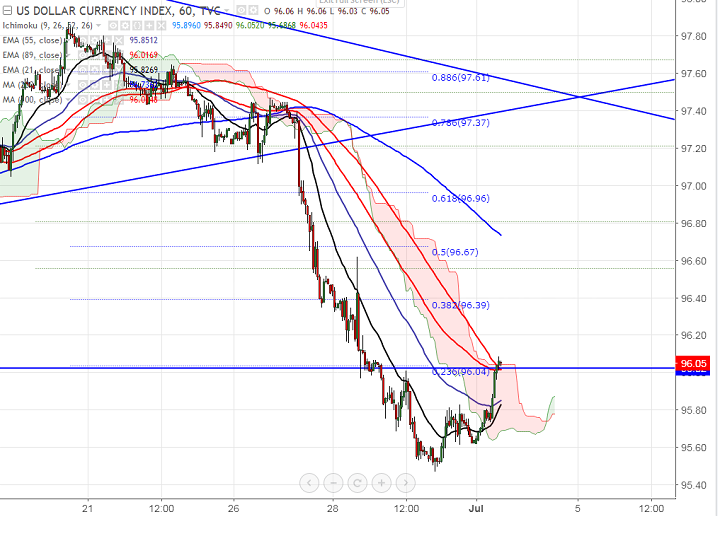- In the hurly chart, index is trading slightly above Tenken-Sen (95.88) and Kijun-Sen (95.83) . The index should close above cloud (96.04) in the hourly for the intraday bullishness.
