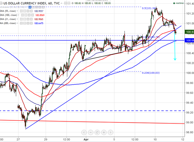 - US Dollar index breaks major intraday trend line support at 100.86 and declined till 100.77 level. The index trades slightly below trend line a decline till 100.25 (Mar 31st 2017 low) is possible.