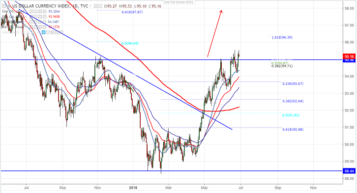 - US Dollar index has shown a massive sell- off after hitting high of 95.50. The index declined more than 120 pips and hits low of 94.17. After minor weakness DXY recovered sharply in the past three trading session almost 135 pips. It hits high of 95.53 at the time of writing. It is currently trading at 95.21. The index has formd a double top around 95.53 and any convincing break above confirms further bullishness.