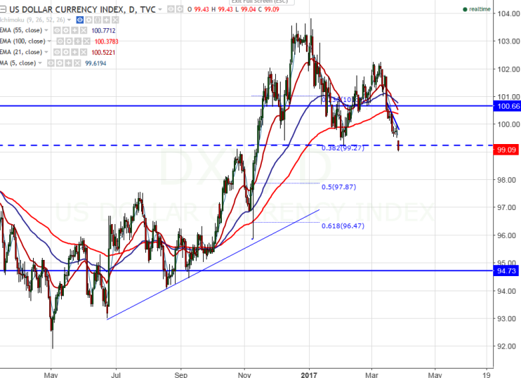 - DXY tumbles to 1-1/2 month low after Trump failed to push through his health care act. The index breaks 99.23 major support and declined till 98.90.