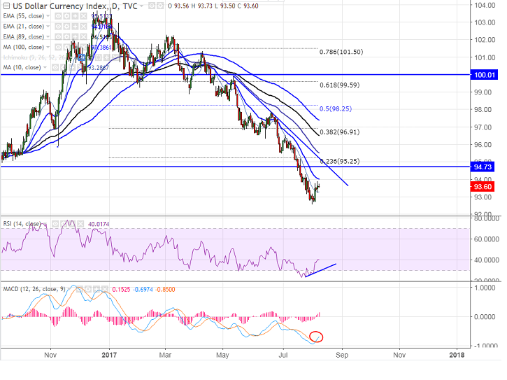 - The index broken minor resistance at 93.25 (10- day MA) and it has closed above that level for past three days. The major resistance is around 94.05 (21- day EMA) and any break above that level will take the pair till 95/95.25 (23.6% retracement of 102.95 and 92.55).