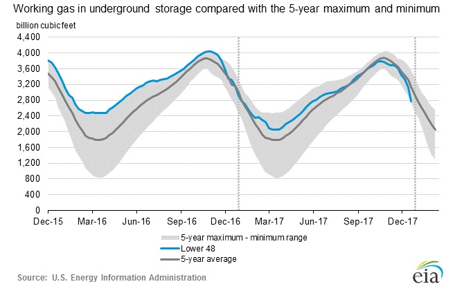 According to the latest numbers, working gas in the underground storage remains at 2.767 trillion cubic feet (Tcf). Stocks were 415 billion cubic feet (Bcf) than last year at this time and 382 Bcf below the five-year average. The chart from EIA shows the level of inventory. The second chart from investing.com shows weekly changes in inventory.