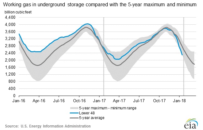 - Gas price has moved higher as the inventories are declined fast due to the polar vortex and the market is currently pricing that the storage is likely to drop to 1.24 trillion cubic feet by the end of the winter.