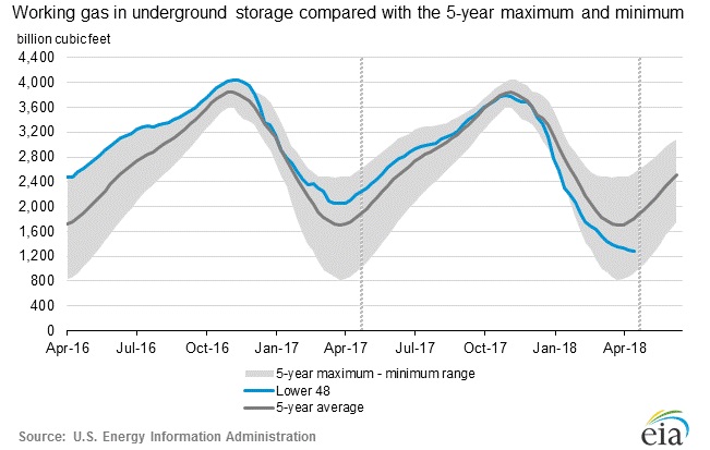 According to the latest numbers, working gas in the underground storage remains at 1.281 trillion cubic feet (Tcf). Stocks are 897 billion cubic feet (Bcf) lower than last year at this time and 527 Bcf below the five-year average. The chart from EIA shows the level of inventory. The second chart from investing.com shows weekly changes in inventory.