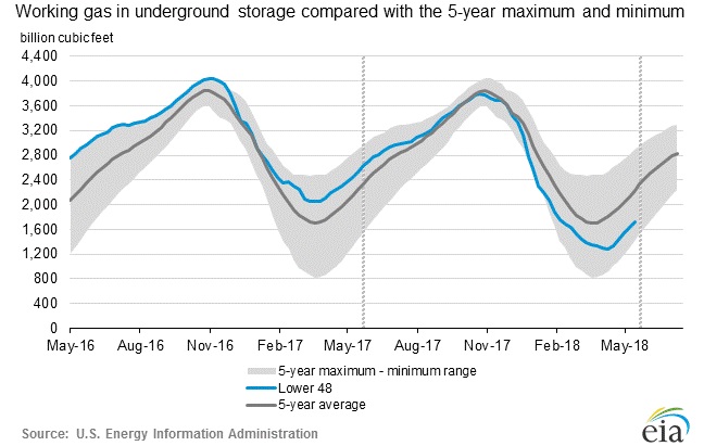 According to the latest numbers, working gas in the underground storage remains at 1.725 trillion cubic feet (Tcf). The chart from EIA shows the level of inventory. The second chart from investing.com shows weekly changes in inventory.