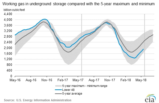 According to the latest numbers, working gas in the underground storage remains at 1.913 trillion cubic feet (Tcf). Stocks are 785 Bcf less than last year at this time and 507 Bcf below the five-year average. The chart from EIA shows the level of inventory. The second chart from investing.com shows weekly changes in inventory.