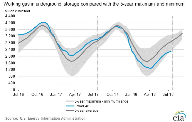 According to the latest numbers, working gas in the underground storage remains at 2.308 trillion cubic feet (Tcf). Stocks are 688 Bcf less than last year at this time and 565 Bcf below the five-year average. The chart from EIA shows the level of inventory. The second chart from investing.com shows weekly changes in inventory.