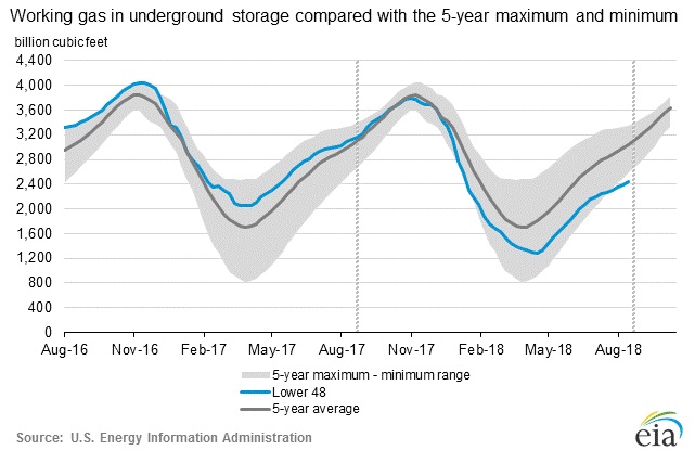 According to the latest numbers, working gas in the underground storage remains at 2.435 trillion cubic feet (Tcf). Stocks are 684 Bcf less than last year at this time and 599 Bcf below the five-year average. The chart from EIA shows the level of inventory. The second chart from investing.com shows weekly changes in inventory.