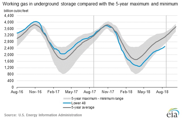 According to the latest numbers, working gas in the underground storage remains at 2.505 trillion cubic feet (Tcf). Stocks are 646 Bcf less than last year at this time and 588 Bcf below the five-year average. The chart from EIA shows the level of inventory. The second chart from investing.com shows weekly changes in inventory.