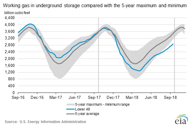 According to the latest numbers, working gas in underground storage remains at 2.866 trillion cubic feet (Tcf). Stocks are 636 Bcf less than last year at this time and 607 Bcf below the five-year average. The chart from EIA shows the level of inventory. The second chart from investing.com shows weekly changes in inventory.