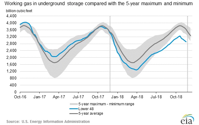 According to the latest numbers, working gas in underground storage remains at 2.914 trillion cubic feet (Tcf). Stocks are 722 Bcf less than last year at this time and 723 Bcf below the five-year average. The chart from EIA shows the level of inventory. The second chart from investing.com shows weekly changes in inventory.