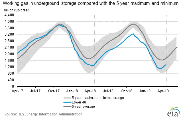 According to the latest numbers, working gas in the underground storage remains at 1.339 trillion cubic feet (Tcf). Stocks are 55 bcf less than last year, and 369 bcf below the five-year average. The chart from EIA shows the level of inventory. The second chart from investing.com shows weekly changes in inventory.