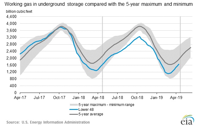 According to the latest numbers, working gas in the underground storage remains at 1.653 trillion cubic feet (Tcf). Stocks are 130 bcf higher less than last year, and 286 bcf below the five-year average. The chart from EIA shows the level of inventory. The second chart from investing.com shows weekly changes in inventory.