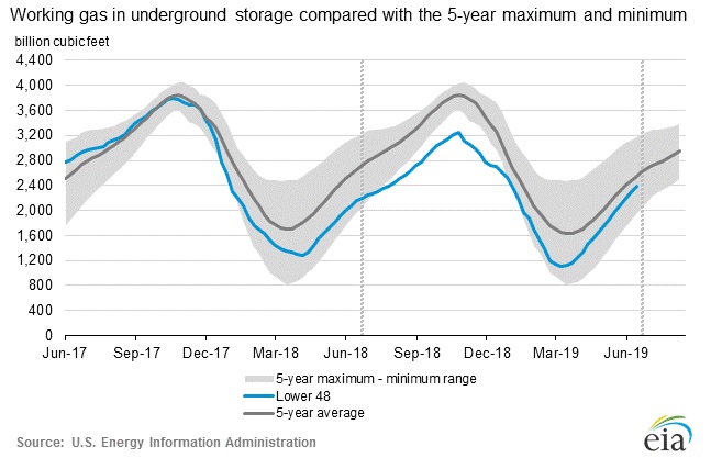 According to the latest numbers, working gas in the underground storage remains at 2.390 trillion cubic feet (Tcf). Stocks are 249 bcf higher less than last year, and 152 bcf below the five-year average. The chart from EIA shows the level of inventory. The second chart from investing.com shows weekly changes in inventory.