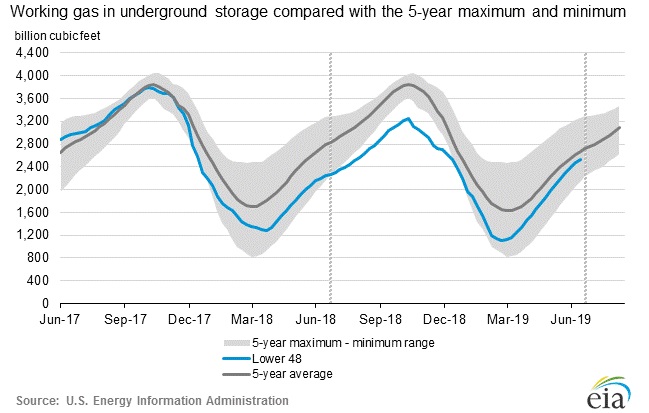According to the latest numbers, working gas in the underground storage remains at 2.533 trillion cubic feet (Tcf). Stocks are 291 bcf higher than last year, and 143 bcf below the five-year average. The chart from EIA shows the level of inventory. The second chart from investing.com shows weekly changes in inventory.