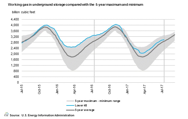According to latest numbers, working gas in the underground storage remains at 2.990 trillion cubic feet. Stocks were 302 Billion cubic feet less than last year at this time and 111 Billion cubic feet above the five-year average. The chart from EIA shows the level of inventory. The second chart from investing.com shows weekly changes in inventory.