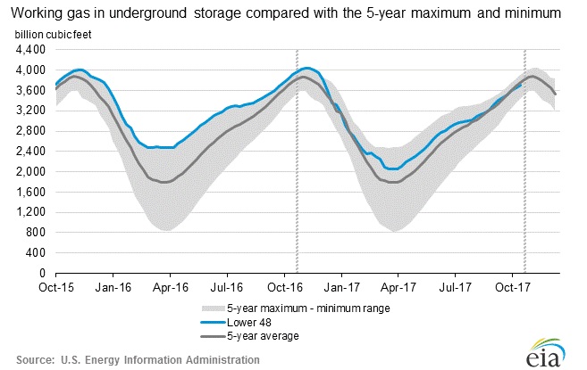 According to the latest numbers, working gas in the underground storage remains at 3.71 trillion cubic feet. Stocks are 189 Billion cubic feet less than last year at this time and 46 Billion cubic feet below the five-year average. The chart from EIA shows the level of inventory. The second chart from investing.com shows weekly changes in inventory.