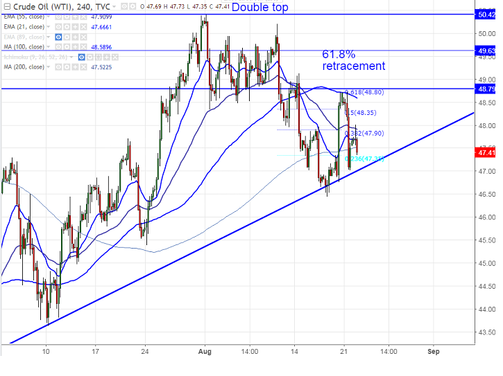 - US Oil has formed a temporary top around $50.40 and started to decline from that level. Crude decline till $46.44 on Aug 17th 2017 and is currently trading around $47.42.